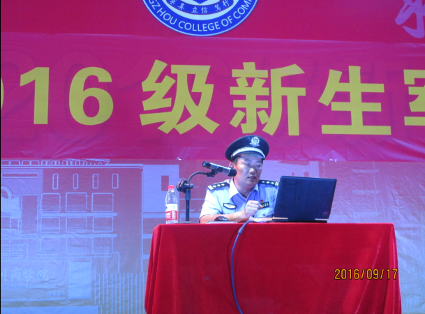 2016年9月17日晚上19:00分,学校学生处、保卫处利用新生军训的有利时机,组织全体新生在运动场开展法制安全教育讲座活动。 法制安全教育讲座由镇龙派出所吴桂强副所长授课,授课内容主要从做好学校安全防范工作的重要性、校园安全防范的薄弱环节、各类校园案例分析及学生自律等方面展开,大大丰富了同学们的防盗、防骗知识。