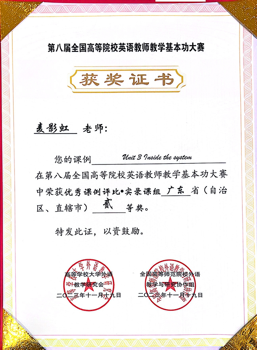近日,第八届全国高等院校英语教师教学基本功大赛在浙江工业大学圆满落幕,我校外国语学院麦影虹老师荣获实录课组省级二等奖。