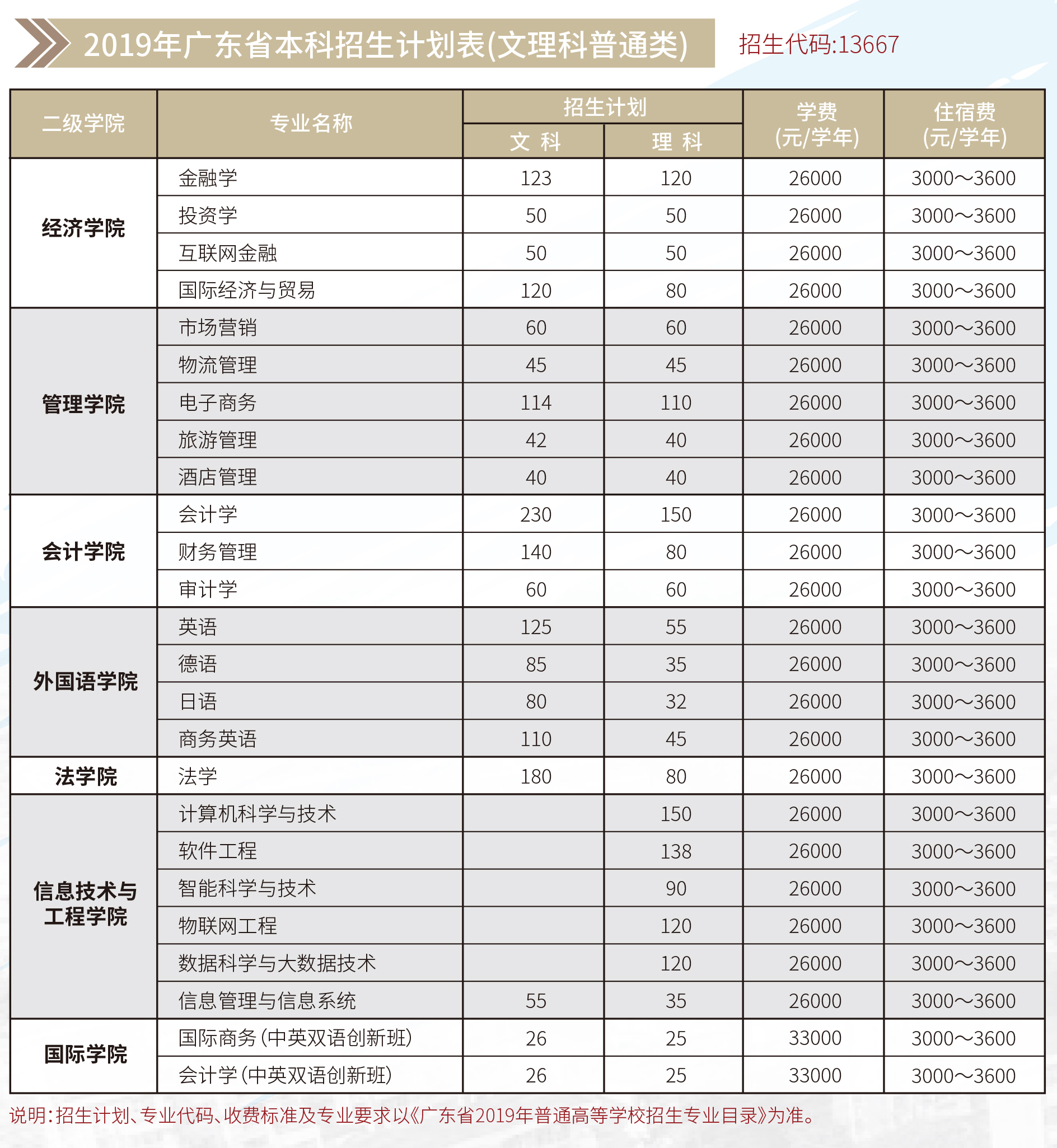 2019年广州商学院广东省招生计划表